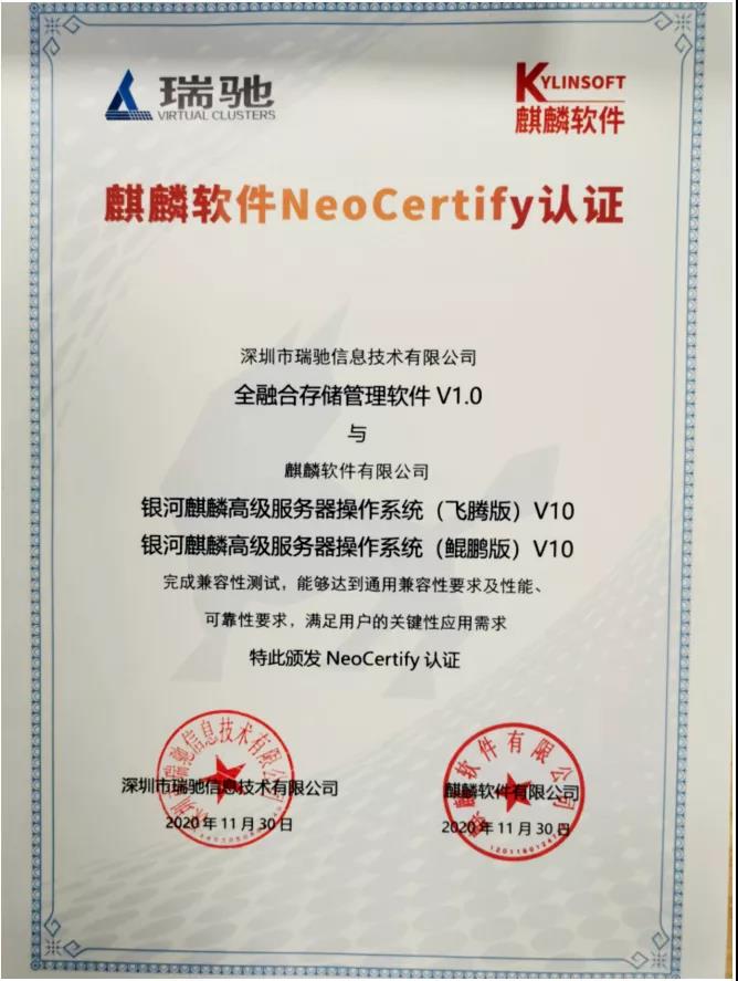 近日,瑞馳與麒麟軟件完成產(chǎn)品兼容性互認證。經(jīng)測試,瑞馳全融合存儲管理軟件V1.0能夠在銀河麒麟高級服務器操作系統(tǒng)V10(飛騰版/鯤鵬版)上穩(wěn)定運行,滿足通用兼容性要求及性能、可靠性要求,滿足用戶的關鍵性應用需求。
