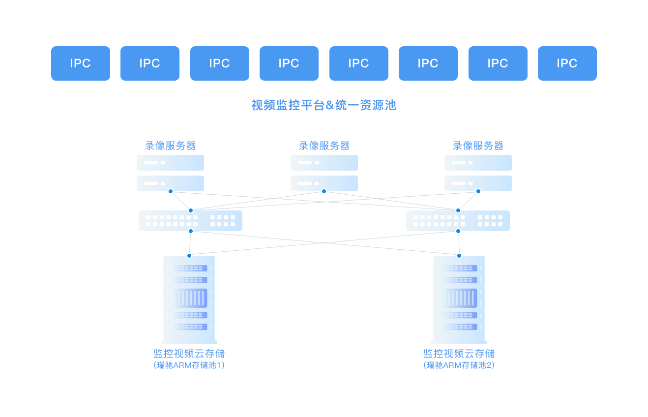 瑞馳提供業(yè)界創(chuàng)新的微集群視頻存儲解決方案,項(xiàng)目通過部署多臺Nxcells高密度低功耗分布式存儲,與X86機(jī)頭服務(wù)器結(jié)合,組成“冷+熱”存儲池。“冷池”中每5個NxCell存儲刀片作為一個“微集群”。視頻寫入冷池時,僅部分“微集群”是活躍的,剩下的不活躍的微集群則處于硬盤休眠狀態(tài),這樣大幅節(jié)省功耗并提高硬盤壽命。一個微集群寫滿,即進(jìn)入休眠狀態(tài),下一個微集群被喚醒…… 此方案既滿足視頻云大容量存儲,又保障前端數(shù)千上萬路攝像頭的正常寫入。高密度低功耗Nxcells存儲比X86服務(wù)器降低50%的運(yùn)營電力消耗,為企業(yè)節(jié)約機(jī)柜租賃設(shè)備維護(hù)費(fèi)用可達(dá)40%。